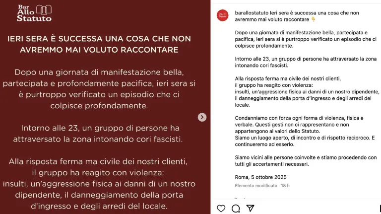 Il bar ha riaperto regolarmente il giorno dopo. Ora la Digos sta analizzando le immagini delle telecamere di sicurezza per identificare i componenti del gruppo e verificare l’eventuale collegamento tra l’assalto a CasaPound e l’incursione Allo Statuto. L’episodio si inserisce in una giornata che ha visto Roma attraversata, secondo gli organizzatori, da un milione di persone per la manifestazione per Gaza e poi segnata da violenze sparse in diverse zone della città. Intanto il locale procederà con tutti gli accertamenti legali necessari, mentre sui social si moltiplicano i messaggi di solidarietà da parte di cittadini e associazioni del quartiere.