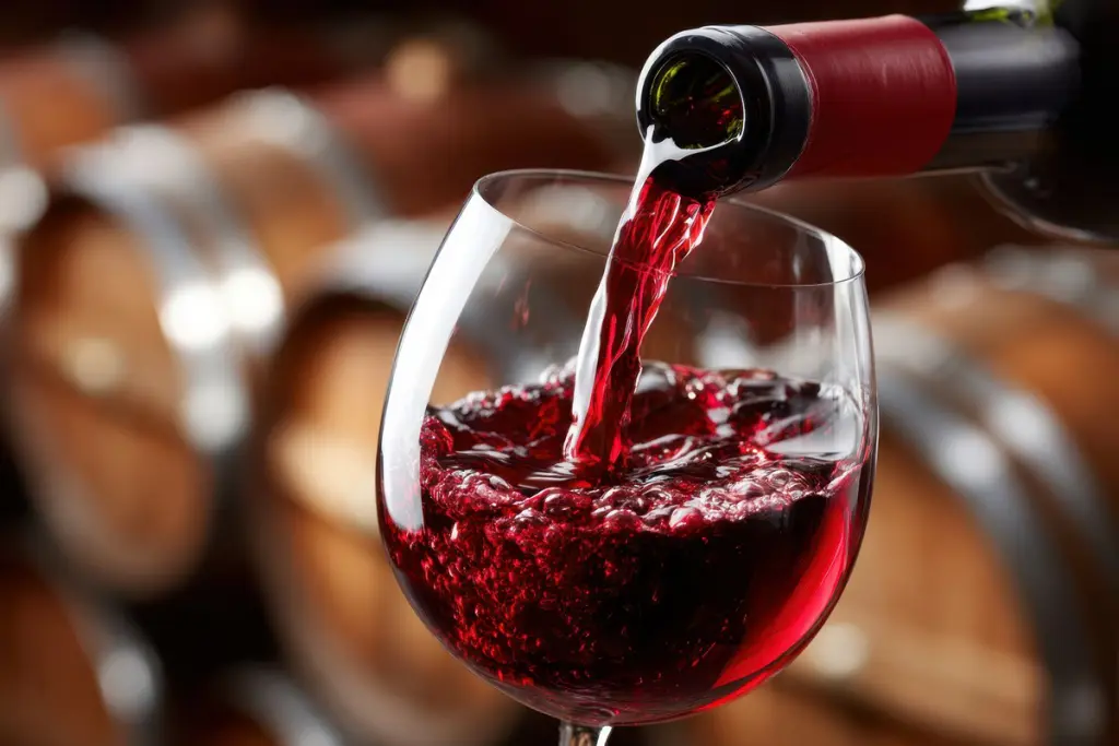 A glass fills with deep red wine as it is poured from a bottle in a winery setting surrounded by barrels.