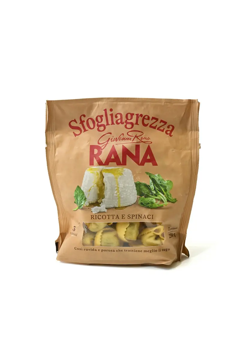 Tra pesto, sughi e piatti pronti lโassortimento della famiglia Rana รจ sconfinato. Ma รจ con la pasta che il fondatore Giovanni ha reso di piรน, partendo con la vendita di tortellini casa per casa fino a costruire un impero commerciale a gittata intercontinentale. Come a suo modo testimonia questo ulteriore piazzamento in graduatoria, figlio dellโinnovazione tecnica correlata alle produzioni su larga scala. Con la linea Sfogliagrezza si diversifica la proposta mettendo sul mercato fagotti ripieni che assomigliano a un cappelletto piรน che a un raviolo squadrato, con una sfoglia piรน robusta, rustica e rugosa rispetto alla gamma Sfogliavelo. Lo spessore della pasta giallo paglierino รจ messo in evidenza dalla struttura โ abbondante allโesterno โ e da unโimbottitura meno corpulenta che consegna un assaggio di discreta masticabilitร , sebbene a tratti pastoso. Si fa composita la palette aromatica: si intrecciano sensazioni retronasali di brodo vegetale, latte e uova, che restituiscono un panorama variegato, ma non disordinato, retto su una sapiditร contenuta che lascia spazio alla timida dolcezza della ricotta. Peccato per la collositร residuale, attribuibile alla gestione degli amidi.