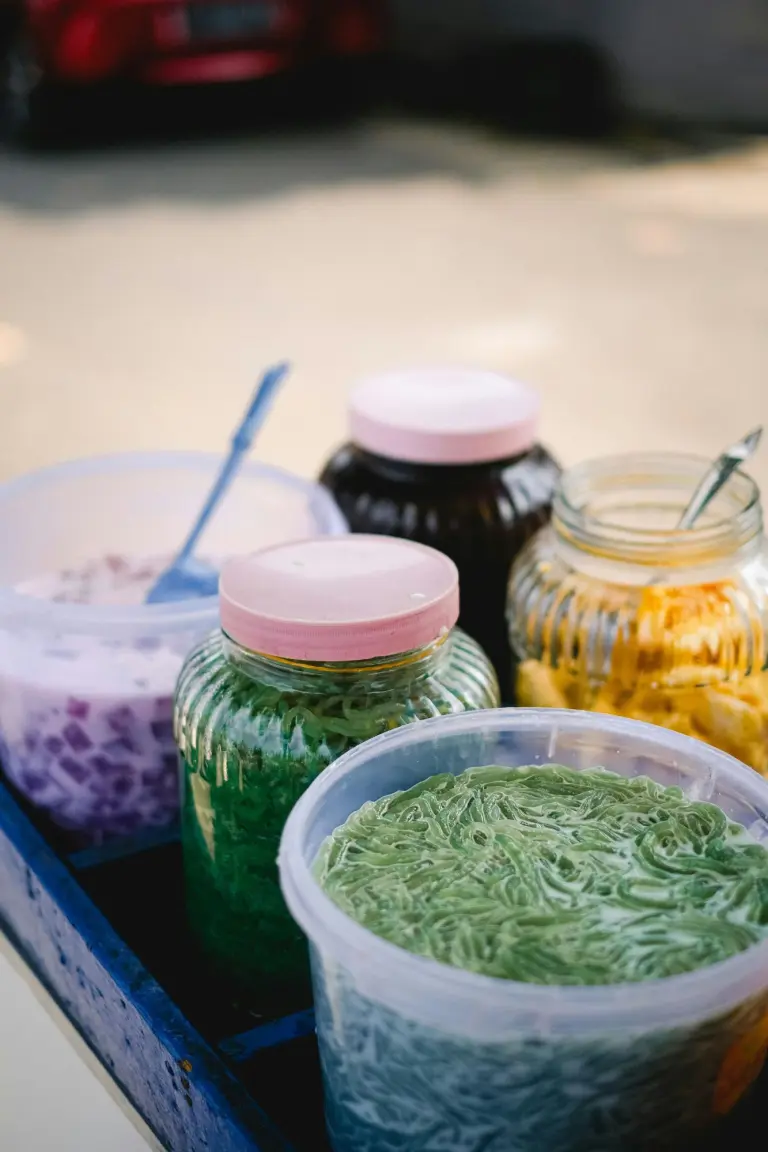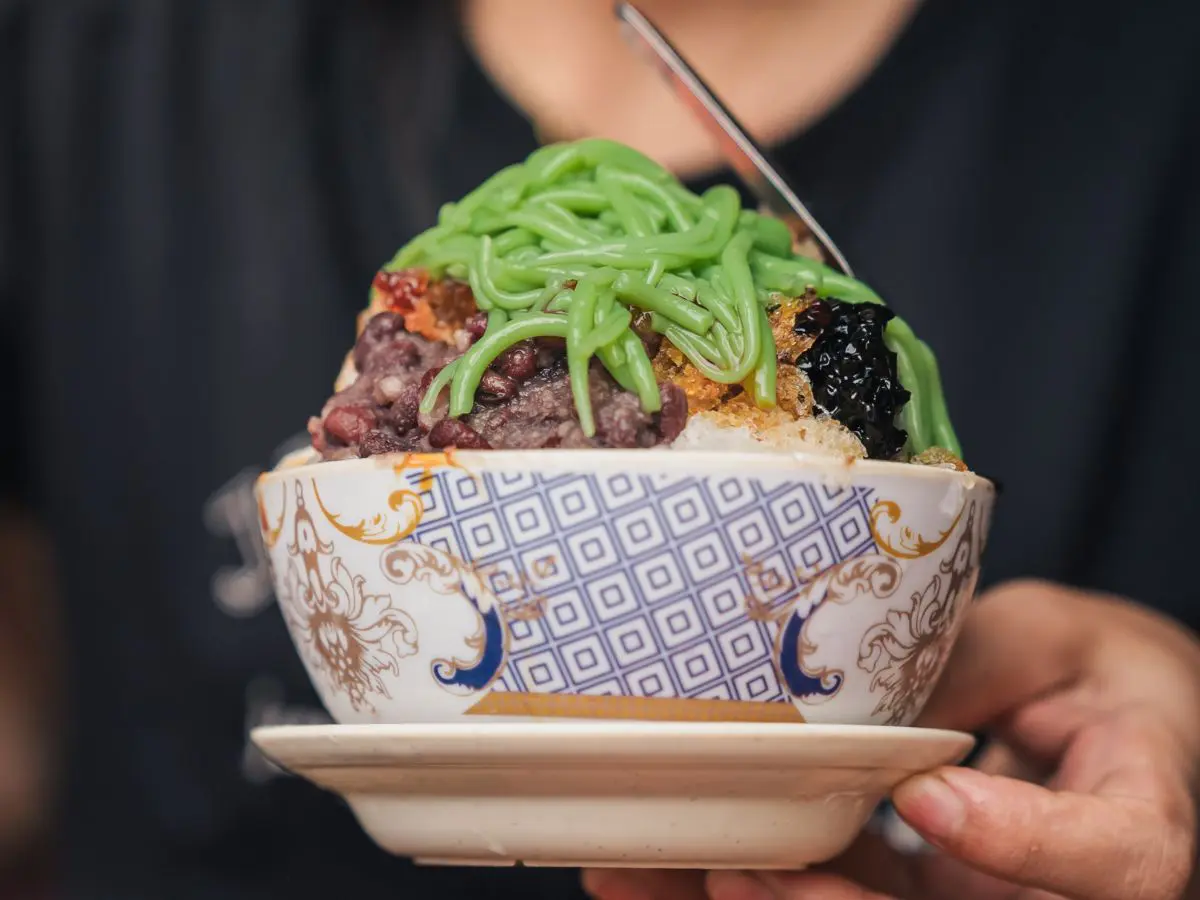 Dessert iconico che unisce gelatina di pandan leaves, latte di cocco, zucchero di palma e ghiaccio