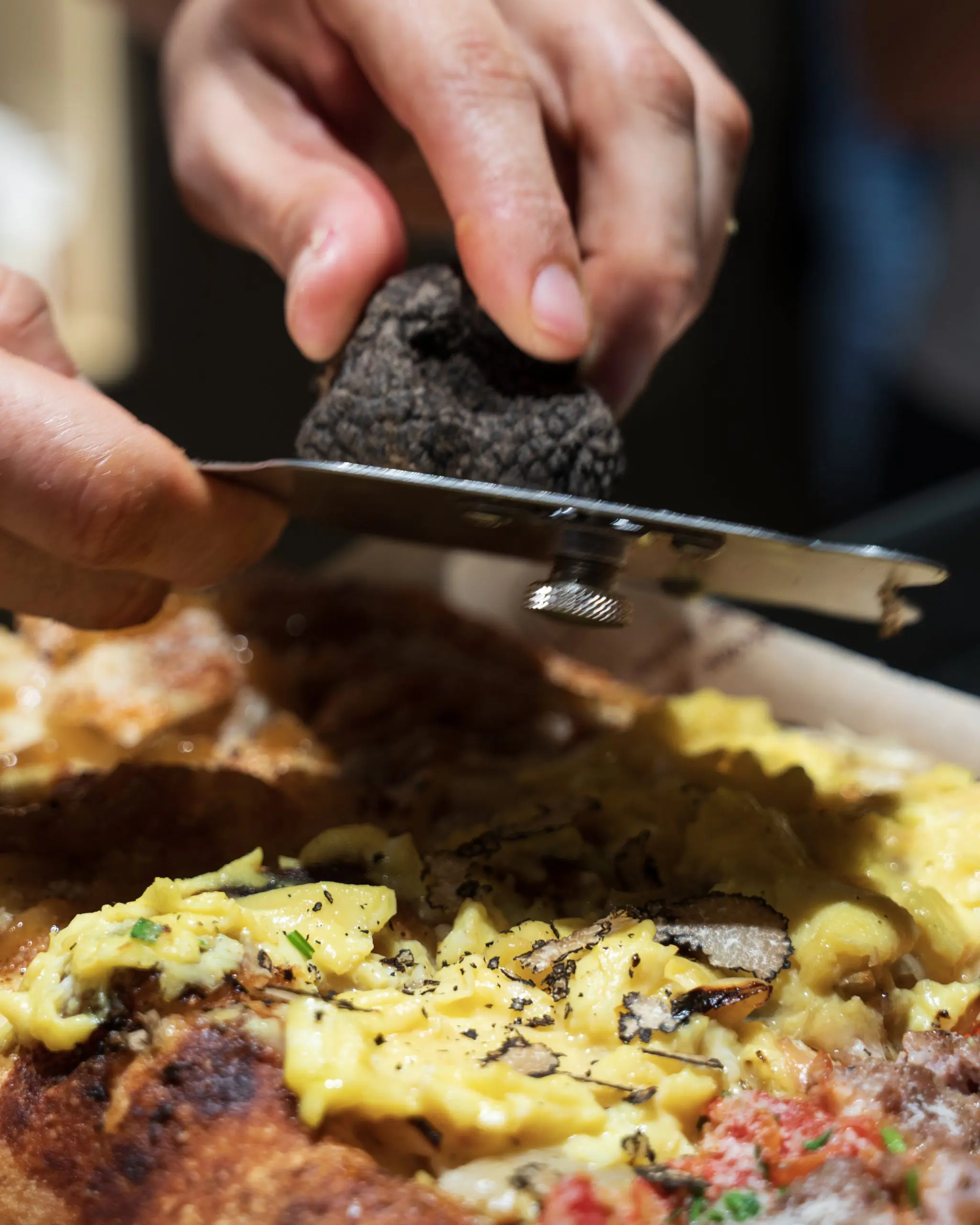 Il nuovo Pizzarium si presenta con la cucina a vista e uno spazio più ampio per fermarsi a mangiare: una lunga panca da venti posti e, come novità assoluta, un bancone esclusivo da quattro sedute prenotabili, lo chef table di Bonci. Ma è sul banco delle teglie che continua il racconto. Ci saranno i grandi classici che hanno fatto scuola: le Patate di Avezzano al rosmarino, la pajata di agnello arrostita, la Mazzancolle con lardo e patate, fino alla Marinella, una marinara che custodisce all’interno la mortadella. Accanto a questi, le invenzioni più iconiche: la pizza con le polpette al sugo, quella con la fettina panata con insalata e maionese o ancora l’azzardo riuscito di uovo strapazzato e tartufo.